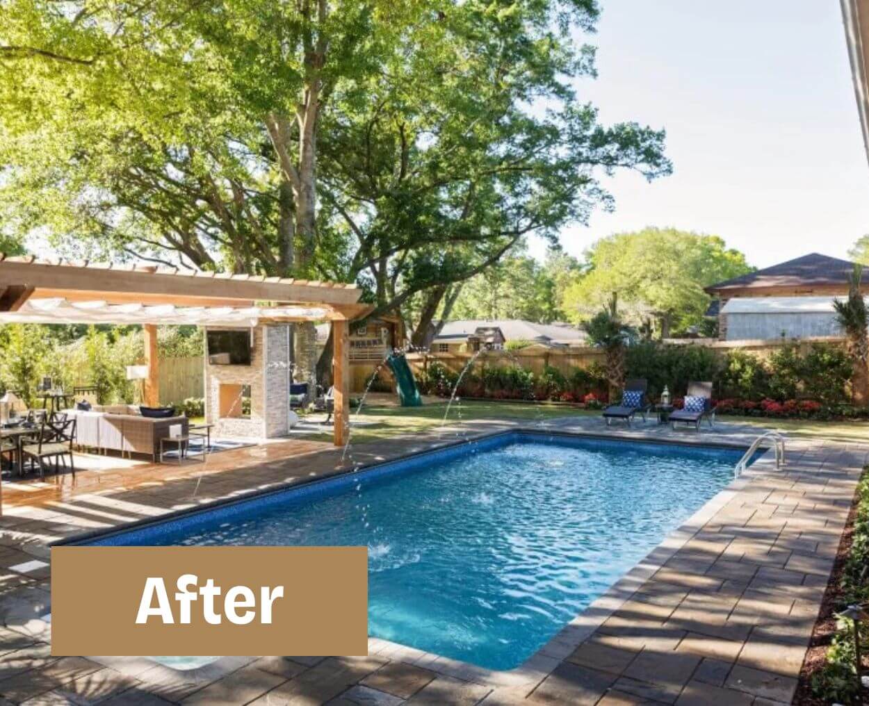 The clients needed shade for their outdoor dining area. We built a custom 16×20 cedar pergola with recessed lighting and ceiling fans. The new stamped concrete patio complements their home's existing architecture.