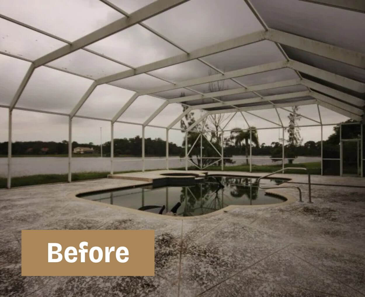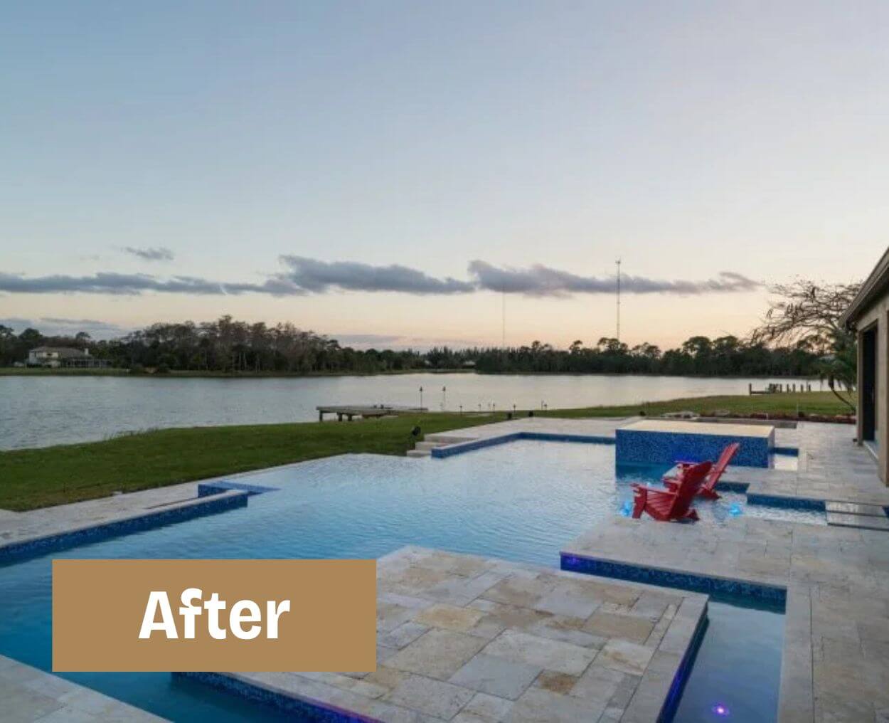 Their old concrete pool deck was cracking and outdated. We replaced it with cool travertine pavers and added a poolside kitchen with grill, refrigerator, and serving bar. Now their backyard feels like a resort.